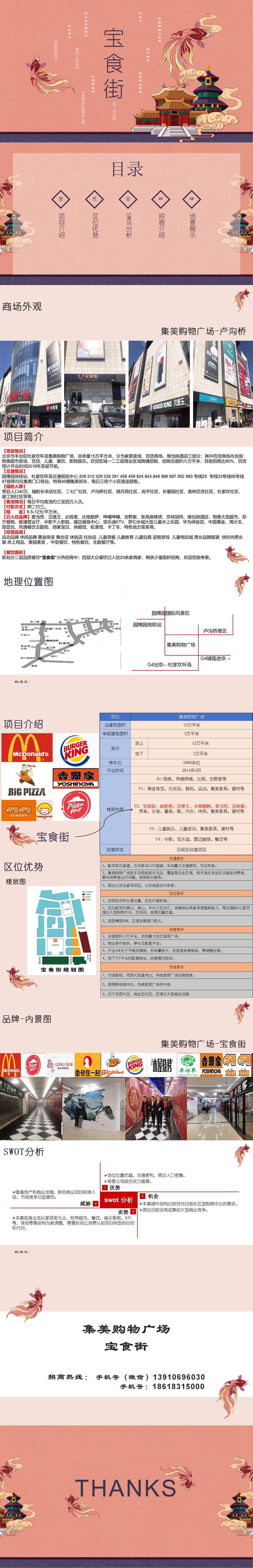 品质餐饮街区招商:西餐、日料、港式餐厅、主题餐厅、品质餐厅、地方特色小吃、特色网红小吃;目前招商区域剩余面积(60、135、145、208平米可组合可拆分)价格6.5-10元/平米,欢迎更多重品质有特色的餐饮和品牌连锁餐饮洽谈。二层品质餐饮街已入驻品牌:麦当劳、必胜客、汉堡王、木屋烧烤、仕比克客、吉祥馄飩、九师公螺蛳粉、煎炸有道、玩儿串串、吴裕泰等十余家知名餐饮和品牌!集美购物广场地下一层地上四层,总面积15万平方米,集商业百货零售、首饰珠宝、化妆品、儿童娱乐、教育培训、中影影院、宝乐迪KTV、礌迈健身、新时尚餐饮区、家具建材、四星康柏酒店、物美超市卖场等众多业态于一体的,北京西南重点规划的大型生活广场。商场周边3公里内覆盖常驻人口40余万,消费群多样,潜在消费客群多,周边有地铁、门前十余条公交线路,园博园景区、卢沟桥景区、大学院校,军学院、研究院、办公群体,商场员工人数达几千人。欢迎考察洽谈!